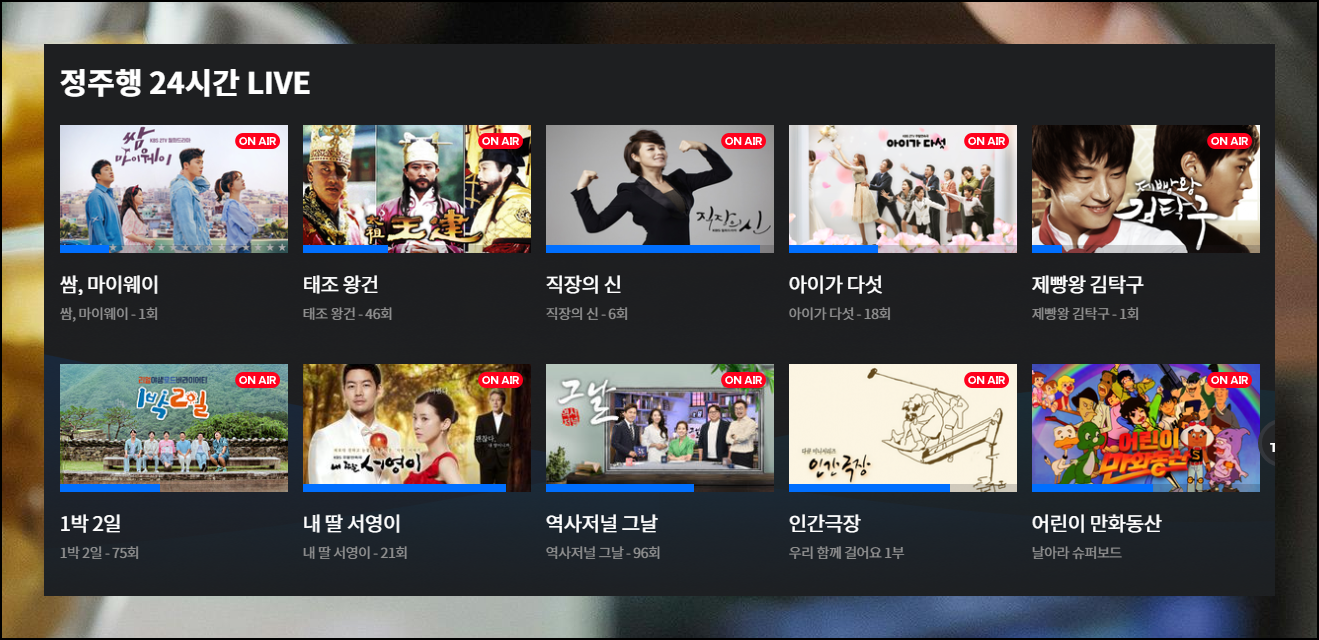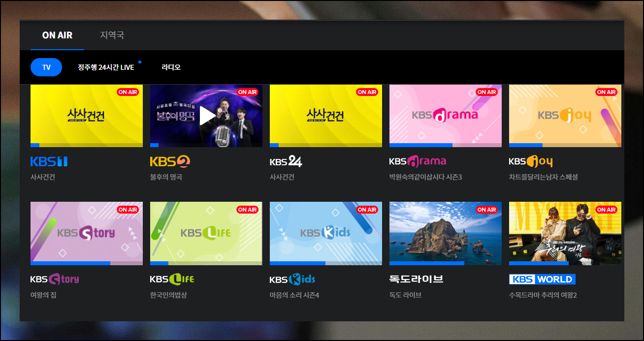 공식 홈페이지에서는 별도의 회원가입 없이도 온에어 서비스를 통해 실시간 생방송을 볼 수 있어 매우 편리해요. 게다가 드라마, 예능, 뉴스 등 특화된 채널부터 24시간 명작 드라마를 재생하는 채널까지 볼거리가 풍성합니다.