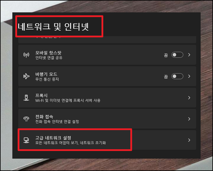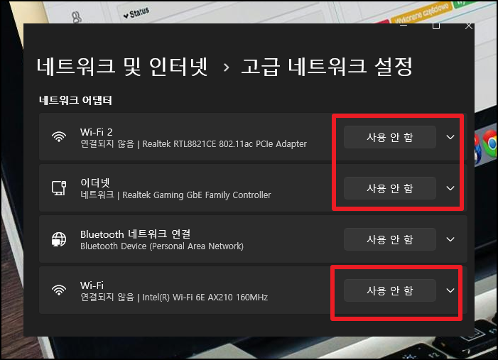 '고급 네트워크 설정' 메뉴를 눌러 랜카드가 정상 작동 중인지, 제대로 활성화되어 있는지 확인할 수 있어요.