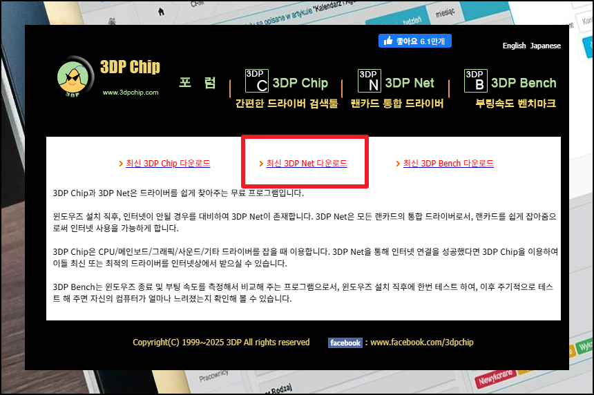 웹 접속이 가능한 다른 기기에서 검색창에 '3dp'를 입력하면 '3dp net'이라는 프로그램을 발견할 수 있어요. 이 솔루션은 온라인 접속용 드라이버를 자동으로 찾아주는 무료 유틸리티입니다.