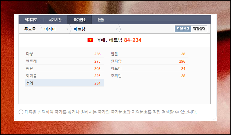 예를 들어, 후에 지역에 있는 친구에게는 84 + 234 + 상대 연락처 순으로 누르면 됩니다.