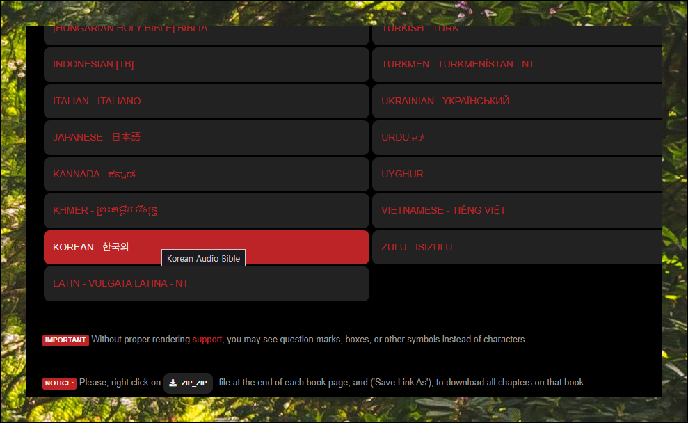 오디오 성경 페이지에서는 다양한 언어 옵션이 준비되어 있습니다. "Korean" 또는 "한국"이라고 표시된 버튼을 누르면 한국어 말씀듣기 페이지로 이동합니다.