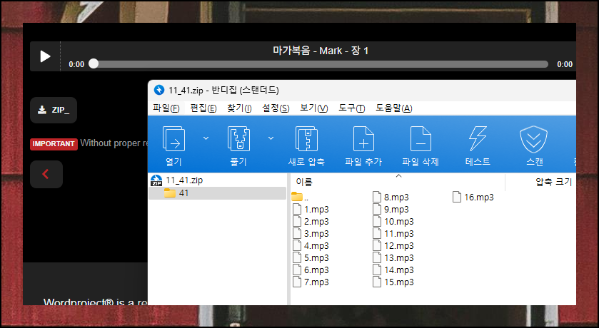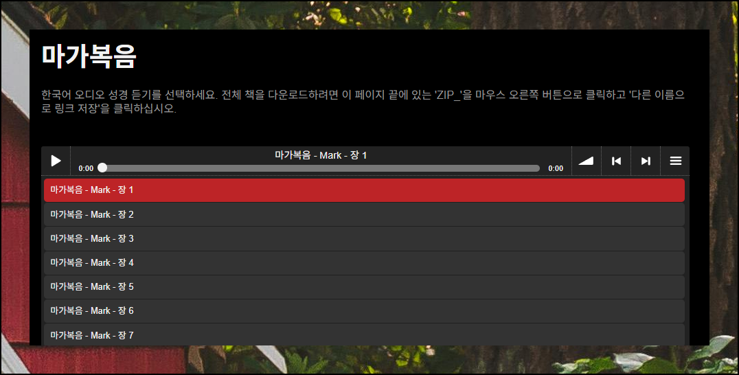 플레이어 좌측 하단에 있는 [ZIP] 버튼을 누르면 압축 파일을 저장할 수 있습니다. 이 파일을 풀면 MP3 형식의 오디오가 나타나 인터넷 연결 없이도 말씀을 들을 수 있어요.