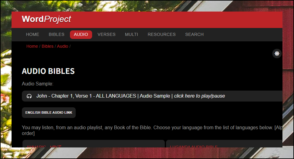 wordproject 사이트에 온라인으로 접속한 후 상단 메뉴에서 [AUDIO] 버튼을 클릭하세요. 오디오 성경 서비스에 접근할 수 있습니다.